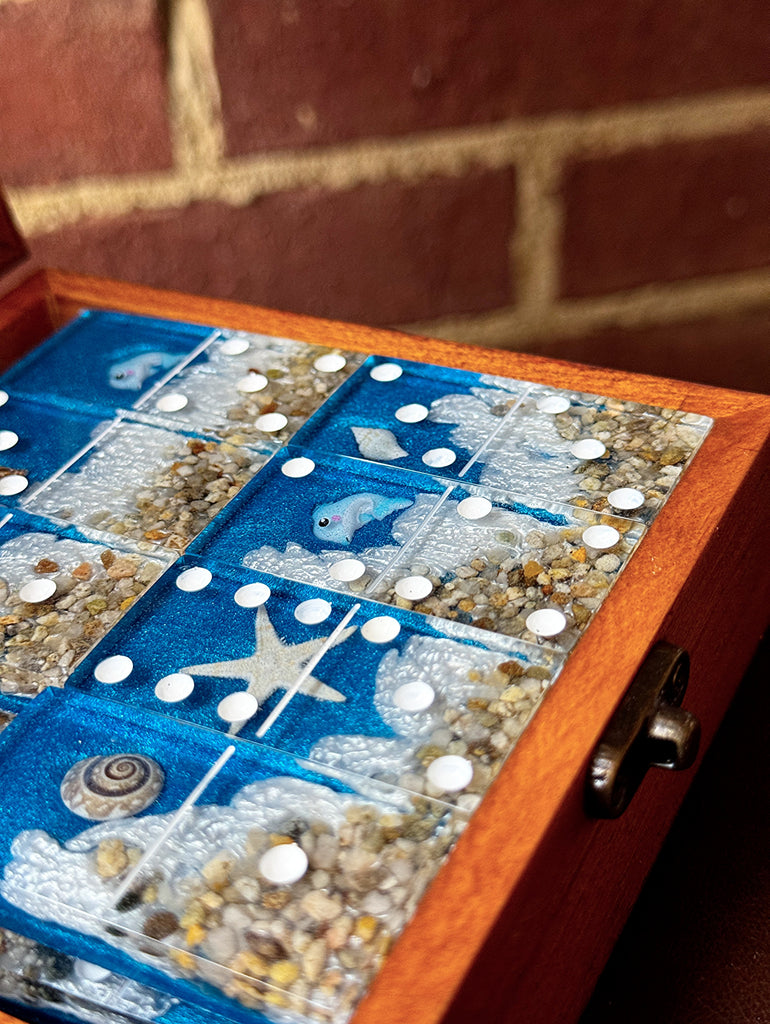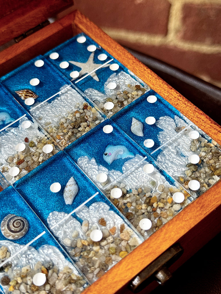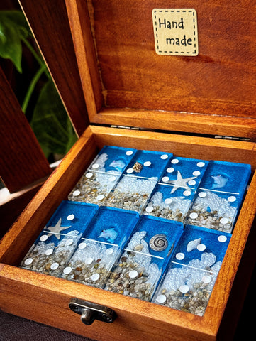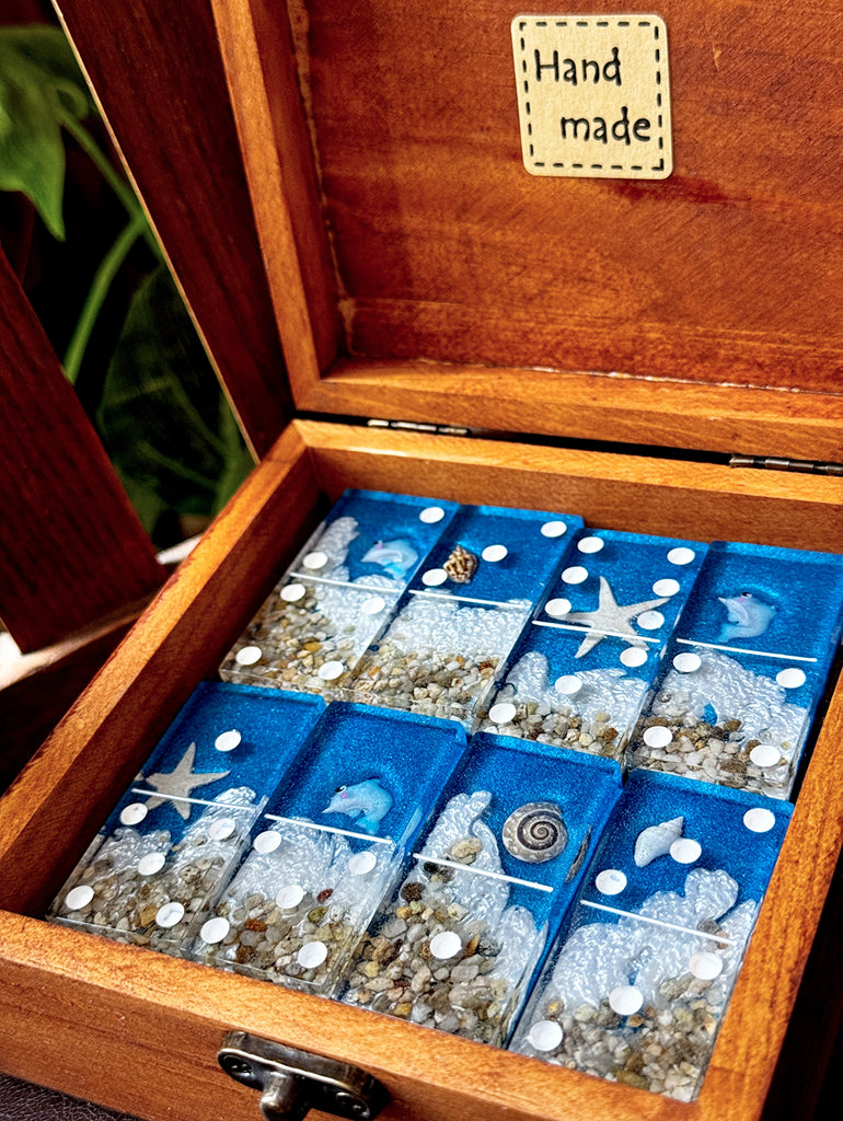 Handmade unique design. Fully playable with opaque backers. Available in: Full 28-tile (Double 6's), 55-tile (Double 9's), or 91-tile (Double 12's) set in a wooden storage box.